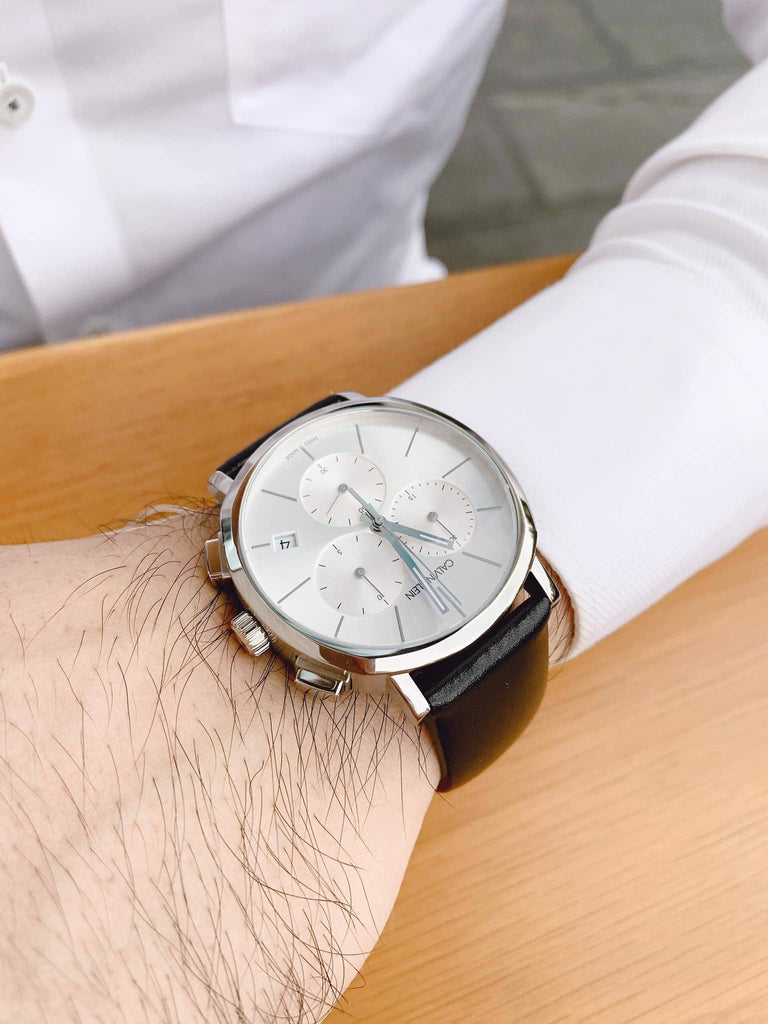 Stainless steel case with a black leather strap. Fixed stainless steel bezel. Silver dial with luminous silver-tone hands and index hour markers. Minute markers around the outer rim. Dial Type: Analog. Luminescent hands. Date display at the 4 o'clock position. Chronograph - three sub-dials displaying: 60 second, 60 minute and 1/10th of a second. Quartz movement. Scratch resistant mineral crystal. Pull / push crown. Solid case back. Round case shape. Case size: 42 mm. Case thickness: 12 mm. Band width: 22 mm. Tang clasp. Water resistant at 30 meters / 100 feet. Functions: chronograph, date, hour, minute, second. Casual watch style. Watch label: Swiss Made. Calvin Klein Posh Chronograph Quartz Silver Dial Men's Watch K8Q371C6.
