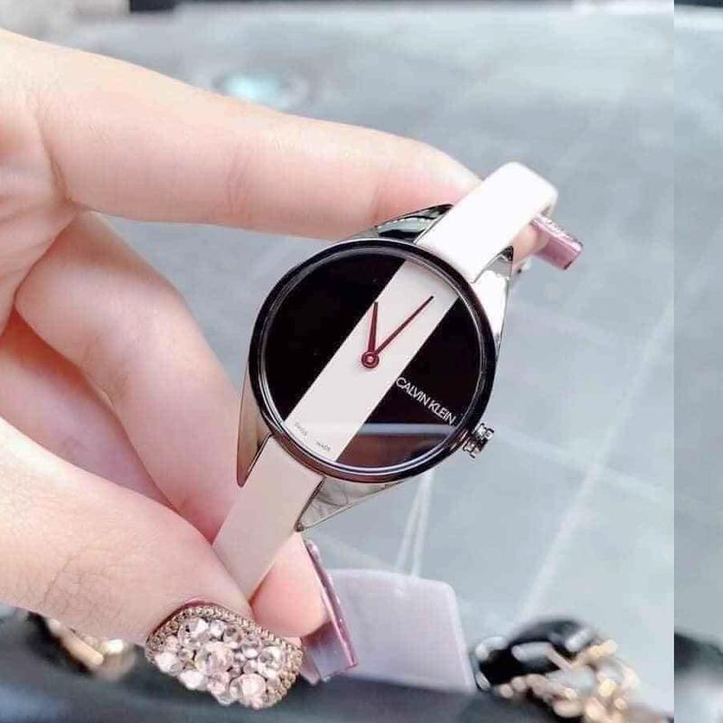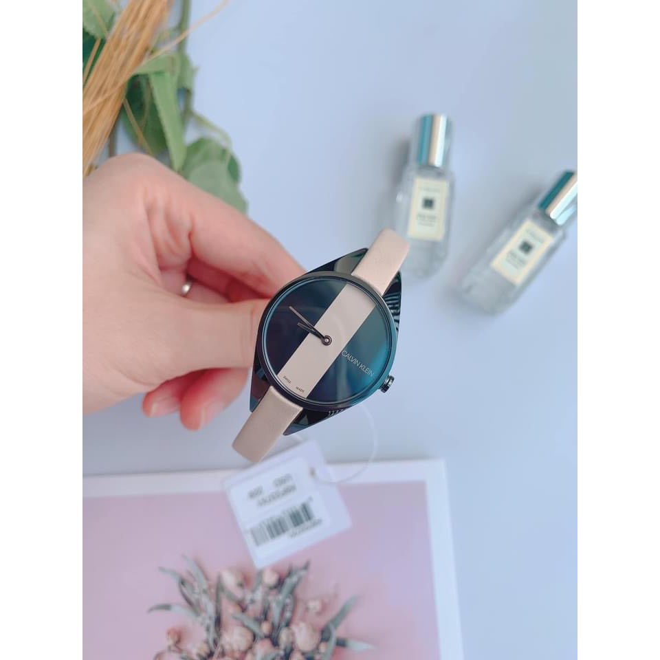 Black PVD stainless steel case with a cream leather strap. Fixed black PVD bezel. Cream and black dial with silver-tone hands. No markers. Dial Type: Analog. Quartz movement. Scratch resistant mineral crystal. Pull / push crown. Solid case back. Round case shape. Case size: 29 mm. Case thickness: 7 mm. Band width: 8 mm. Tang clasp. Water resistant at 30 meters / 100 feet. Functions: hour, minute. Casual watch style. Watch label: Swiss Made. Calvin Klein Rebel Cream and Black Dial Ladies Watch K8P237X1.