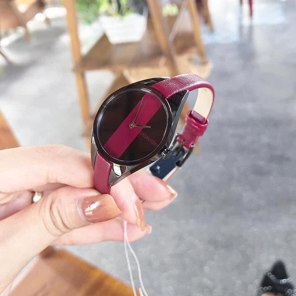 Black PVD stainless steel case with a red leather strap. Fixed black PVD bezel. Red and black dial with silver-tone hands. No markers. Dial Type: Analog. Quartz movement. Scratch resistant mineral crystal. Pull / push crown. Solid case back. Round case shape. Case size: 29 mm. Case thickness: 7 mm. Band width: 8 mm. Tang clasp. Water resistant at 30 meters / 100 feet. Functions: hour, minute. Casual watch style. Watch label: Swiss Made. Calvin Klein Rebel Red and Black Dial Ladies Watch K8P237U1.