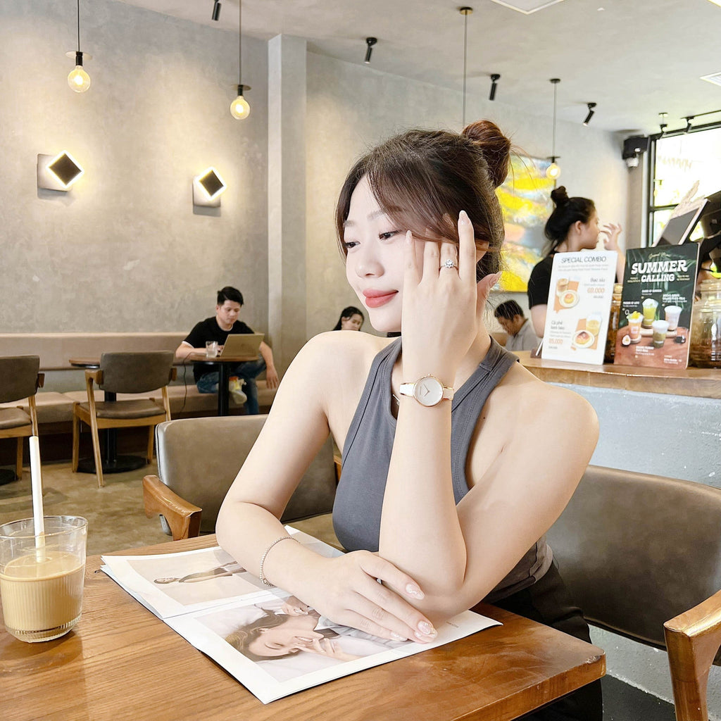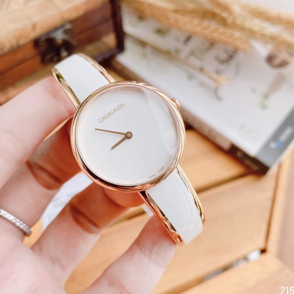 Rose gold PVD stainless steel case with a rose gold PVD stainless steel bangle bracelet with a white resin center. Fixed rose gold PVD bezel. White dial with rose gold-tone hands. No markers. Dial Type: Analog. Quartz movement. Scratch resistant mineral crystal. Pull / push crown. Solid case back. Round case shape. Case size: 30 mm. Case thickness: 8 mm. Band width: 14 mm. Jewelry clasp. Water resistant at 30 meters / 100 feet. Functions: hour, minute. Seduce Series. Casual watch style. Watch label: Swiss Made. Calvin Klein Seduce Quartz White Dial Ladies Watch K4E2N616.