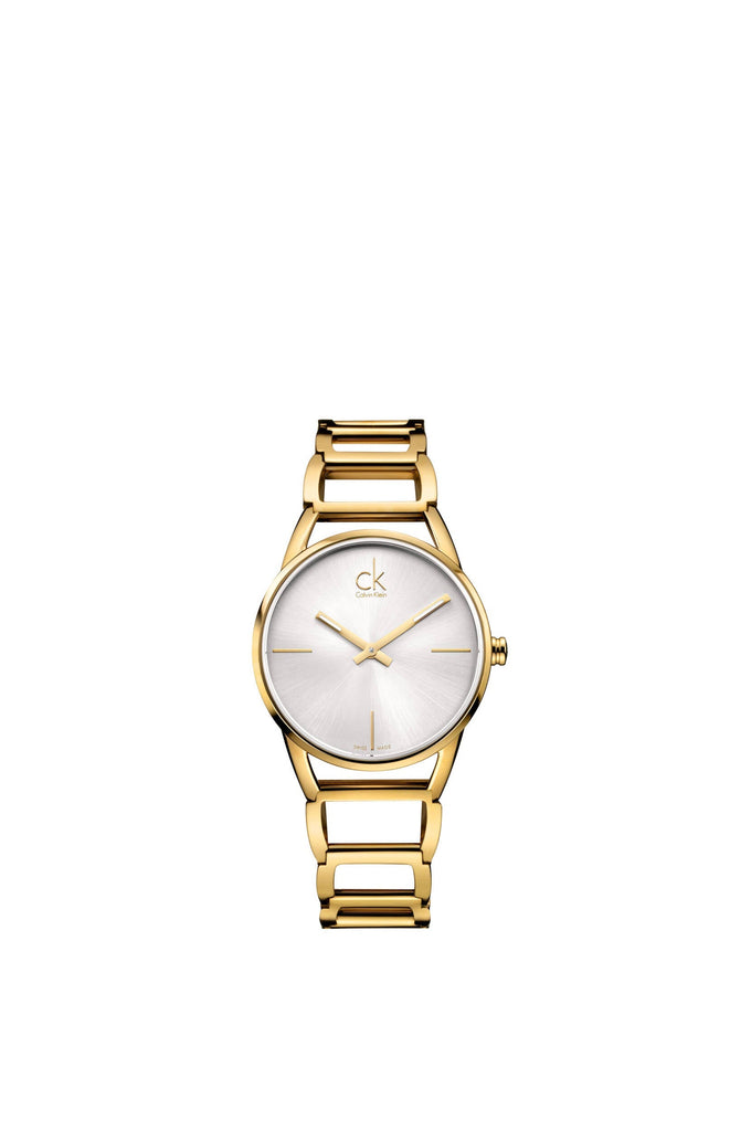 Yellow gold-tone stainless steel case and bangle bracelet. Fixed yellow gold-tone bezel. Silver dial with luminous yellow gold-tone hands. Index markers at the 3, 6 and 9 o'clock positions. Dial Type: Analog. ETA caliber 901.001 quartz movement. Scratch resistant sapphire crystal. Pull / push crown. Solid case back. Round case shape. Case size: 33.50 mm. Case thickness: 8 mm. Band width: 20 mm. Jewelry clasp. Water resistant at 30 meters / 100 feet. Functions: hour, minute. Casual watch style. Watch label: Swiss Movt. Calvin Klein Stately Quartz Silver Dial Ladies Watch K3G23526.