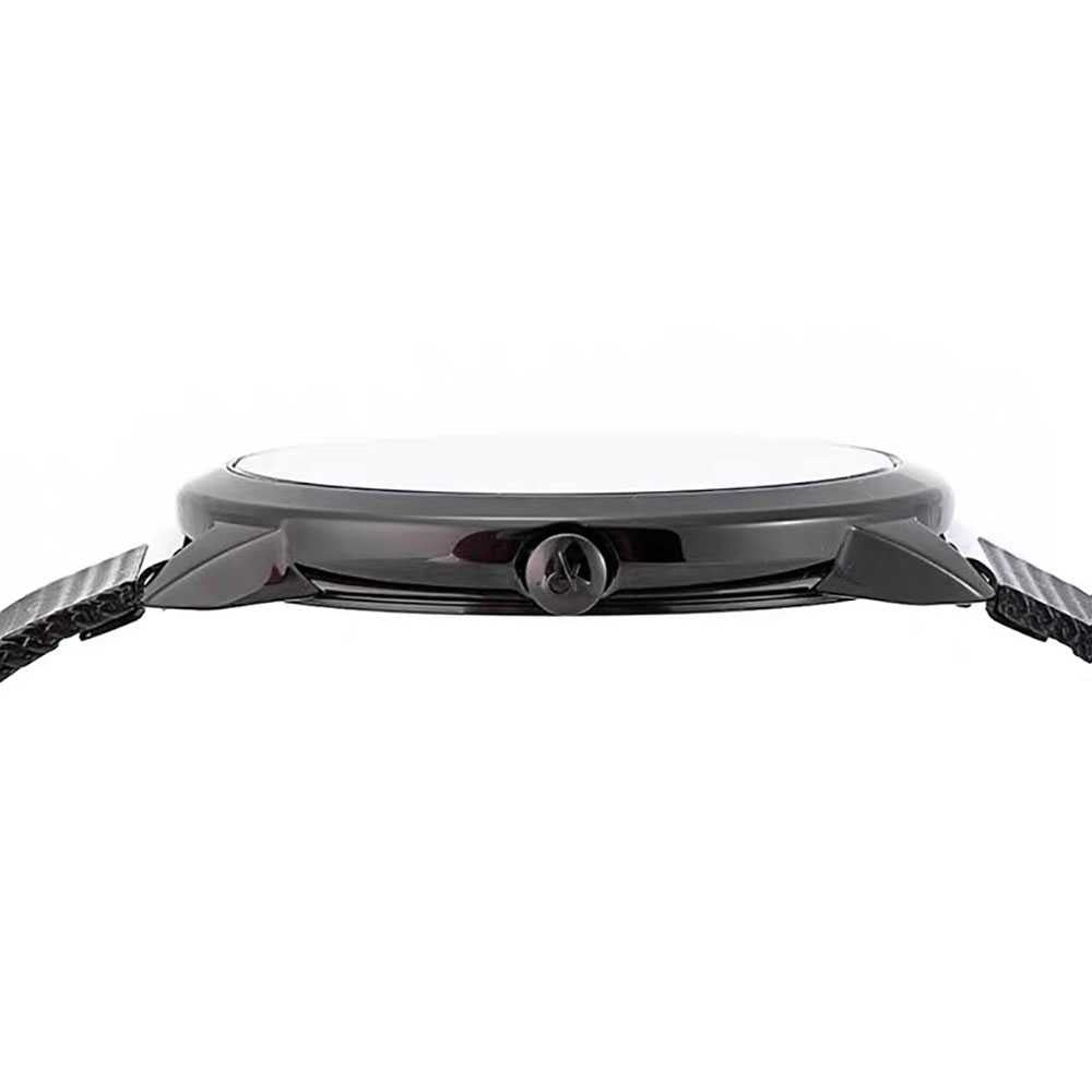 Minimal line man wrist watch with milano knit strap in black steel, black dial with logo and golden hands