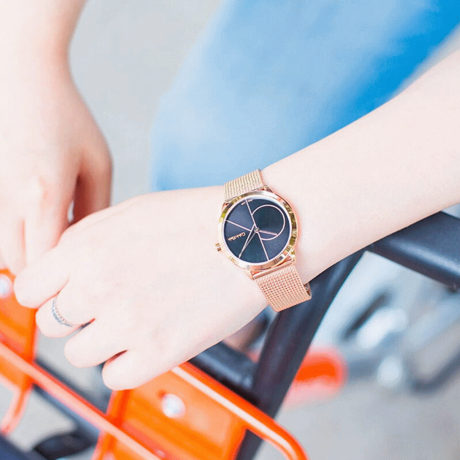 Rose gold PVD stainless steel case with a rose gold PVD stainless steel mesh bracelet. Fixed rose gold PVD bezel. Black dial with rose gold-tone hands. No markers. Dial Type: Analog. Quartz movement. Scratch resistant mineral crystal. Pull / push crown. Solid case back. Round case shape. Case size: 35 mm. Case thickness: 7 mm. Band width: 16 mm. Fold over slip through clasp. Water resistant at 30 meters / 100 feet. Functions: hour, minute. Minimal Series. Casual watch style. Watch label: Swiss Made. Calvin Klein Minimal Quartz Black Dial Ladies Watch K3M22621.