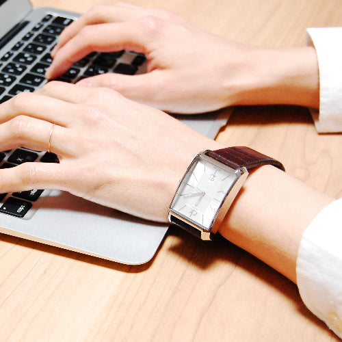 Pull / push crown. Solid case back. Square case shape. Case size: 31 mm. Case thickness: 11 mm. Band width: 22 mm, band length: 7.5 inches. Tang clasp. Water resistant at 30 meters / 100 feet. Functions: date, hour, minute, second. Dress watch style. Watch label: Swiss Made. Calvin Klein Window Silver Dial Ladies Watch K2M21126.