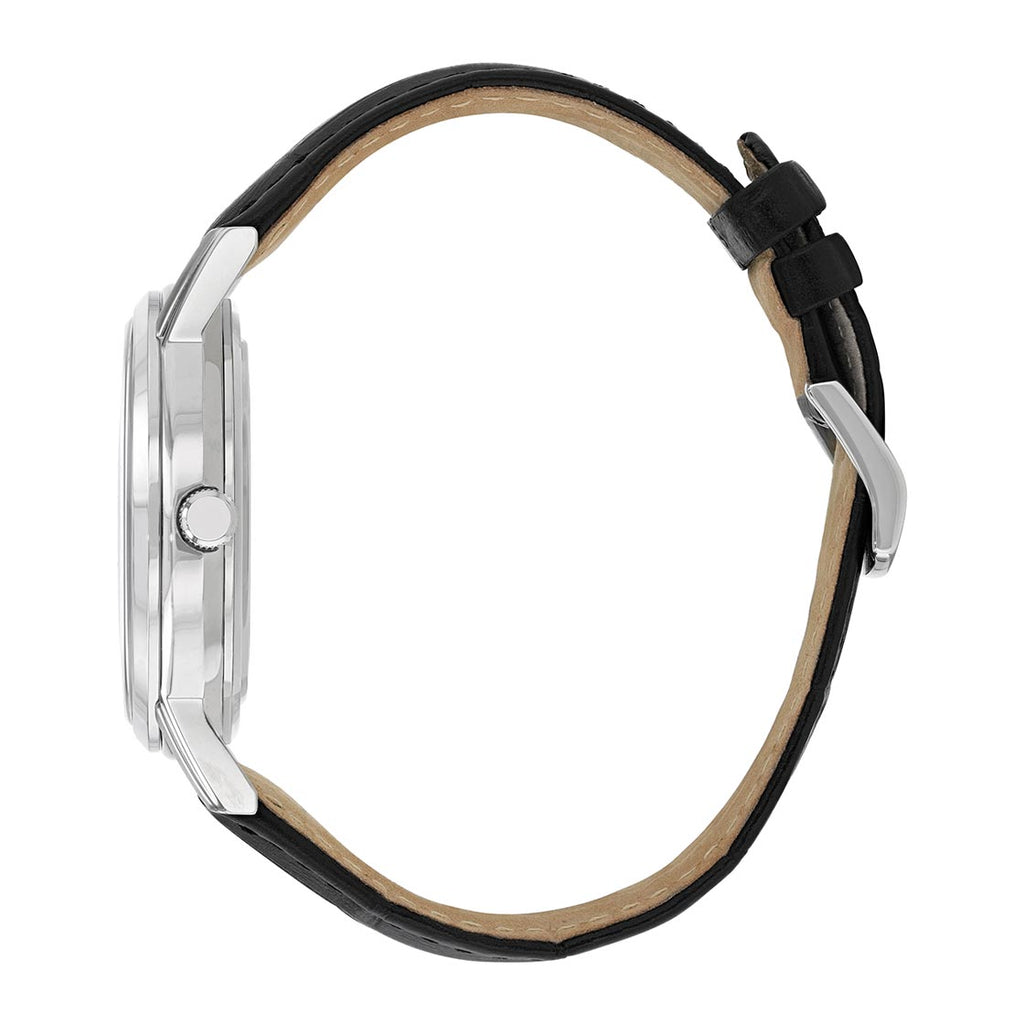 An eco-drive watch, never needing a battery. It contains special features such as a round stainless steel case, black leather strap, silver tone dial with black numerals, Japanese movements and water resistant to 30 meters.