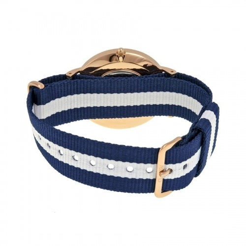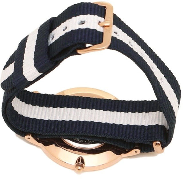 This watch from Daniel Wellington features a blue and white color and a high-quality strap made of NATO (polyester) strap and a stainless steel case measuring 36 mm and 6 mm thick, protected by a layer of strong mineral glass and a reliable quartz movement. The watch has a water resistance of up to 30 meter