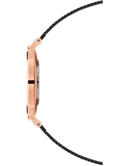 ELEGANT AND DISTINGUISHED. Enter the new season in timeless fashion with Petite Ashfield. This ultra-thin watch rests delicately on the arm and features a matte black mesh strap and a sophisticated black dial. Available with details in rose gold or silver.
