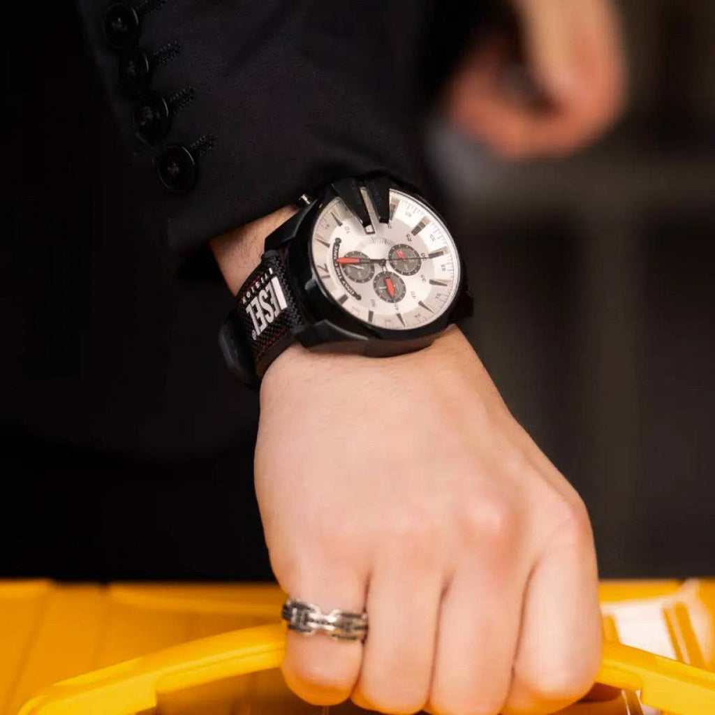 This 51mm Mega Chief watch features a silver dial with black indexes and black printed tracking, chronograph movement and black nylon and silicone strap with white and red Diesel logo detail.