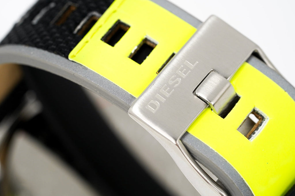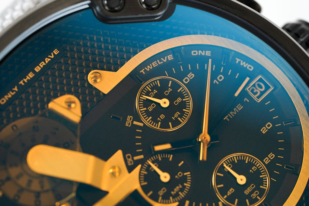 The Diesel Mr. Daddy 2.0 Collection features four separate time zones, two of which are jump hour disc displays, another analog with sub-seconds and finally, a complete chronograph with stopwatch and date.