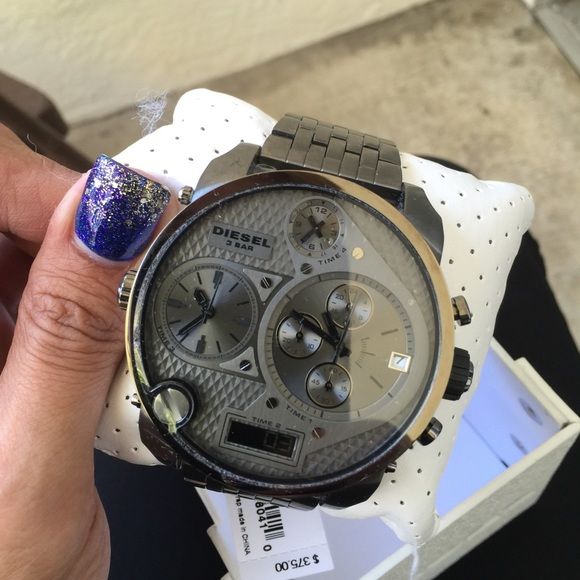 This Diesel Big Daddy DZ7247 comes in gunmetal PVD stainless steel case and bracelet. Fixed gunmetal PVD bezel. Three grey analog dials with grey hands and index hour markers. Minute markers around the outer rim. Single digital time display. Dial Type: Analog-Digital. Luminescent hands and markers. Date display at the 3 o'clock position. Chronograph - three sub-dials displaying: 60 second, 60 minute and 1/10th of a second. Quartz movement. Scratch resistant mineral crystal. Solid case back. Case diameter: 57 mm. Round case shape. Band width: 20 mm. Deployment clasp. Water resistant at 30 meters / 100 feet. Sport watch style.