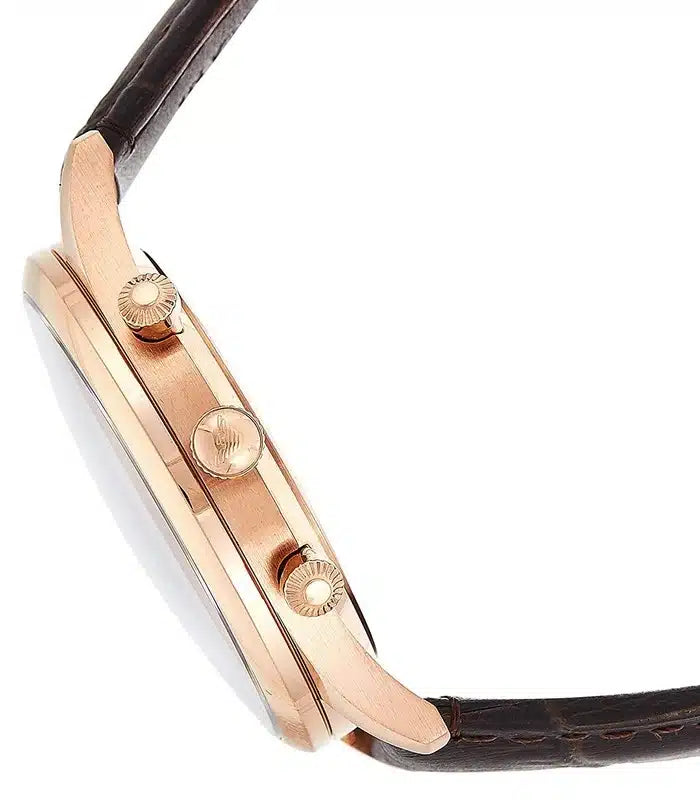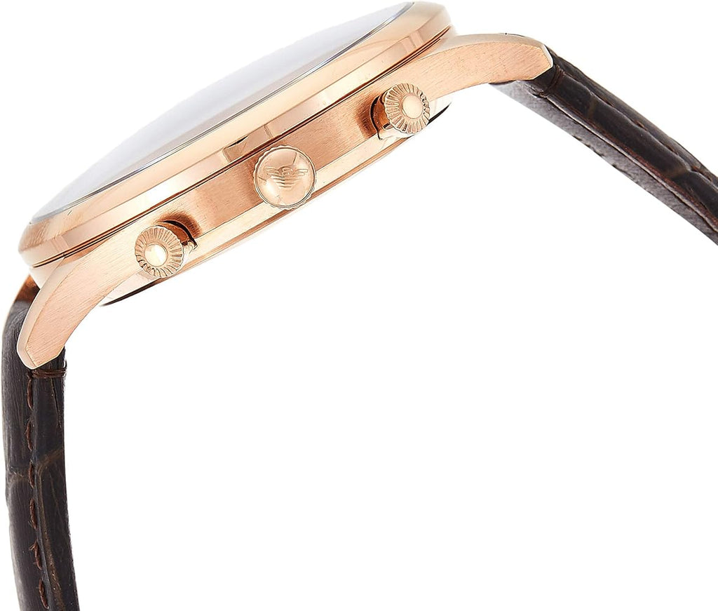 A brown crocodile-embossed leather strap anchors this classic emporio Armani watch. The matte white dial is accented with three subdials, a rose gold-tone top ring, and a signature ea Eagle logo.