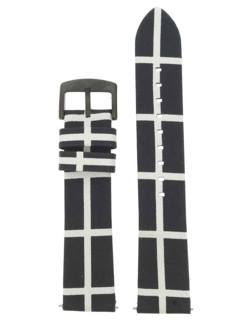 Creatively exploring black and white this Emporio Armani watch features a black and white fabric strap a blackplated case and matching black chronograph dial. Product Details. Dial Color Black Dial Window Material Mineral Display Type Analog Case Material Stainless steel Case Dimension 41 mm Band Material Fabric Band Width 20 mm Clasp Type Tang buckle Movement Quartz Water Resistant 50 M