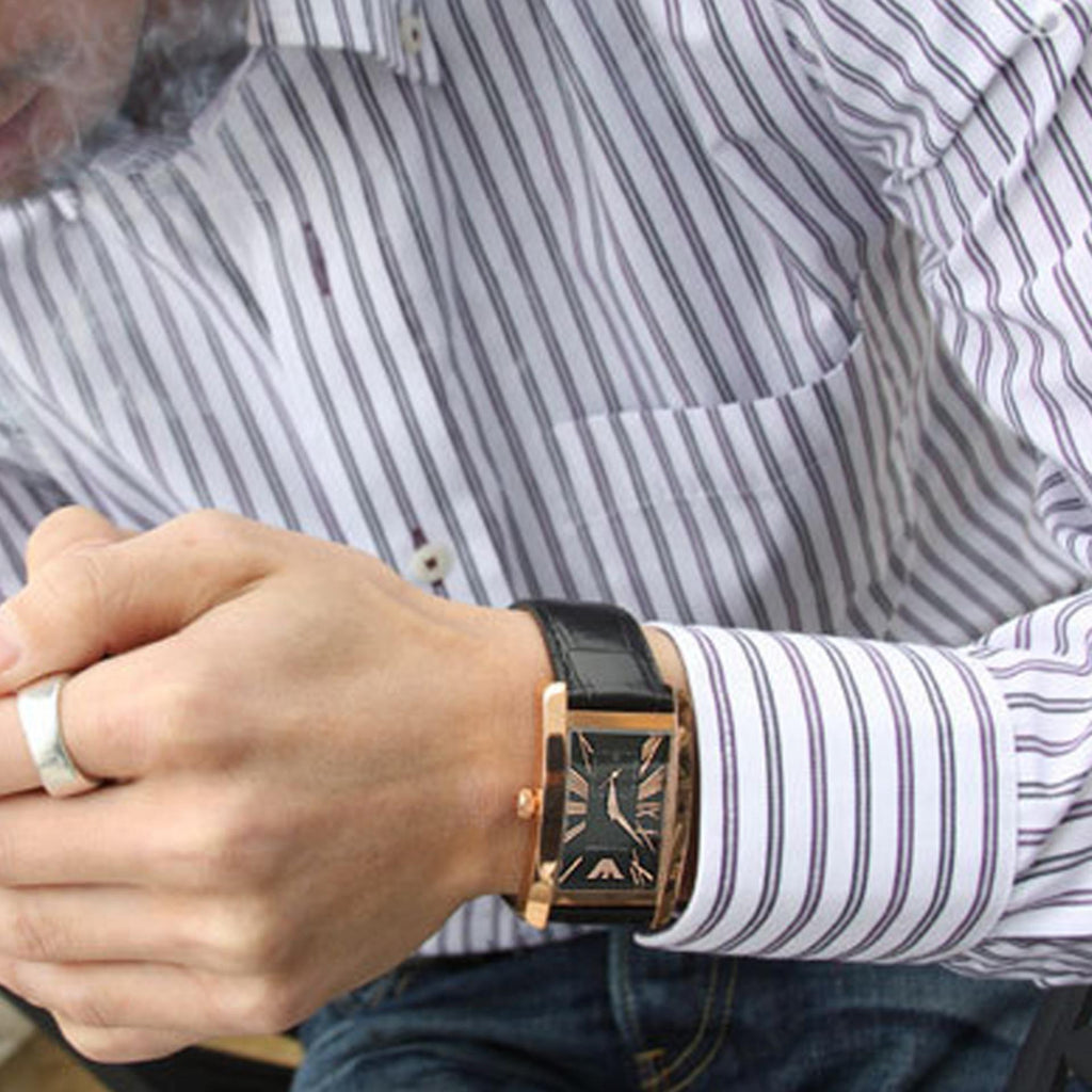 Experience luxury and style with the Emporio Armani Classic Black & Rose Gold Dial Black Leather Strap Watch. The sleek black and rose gold design exudes sophistication while the genuine leather strap provides comfort and durability. Make a statement with this timeless timepiece.
