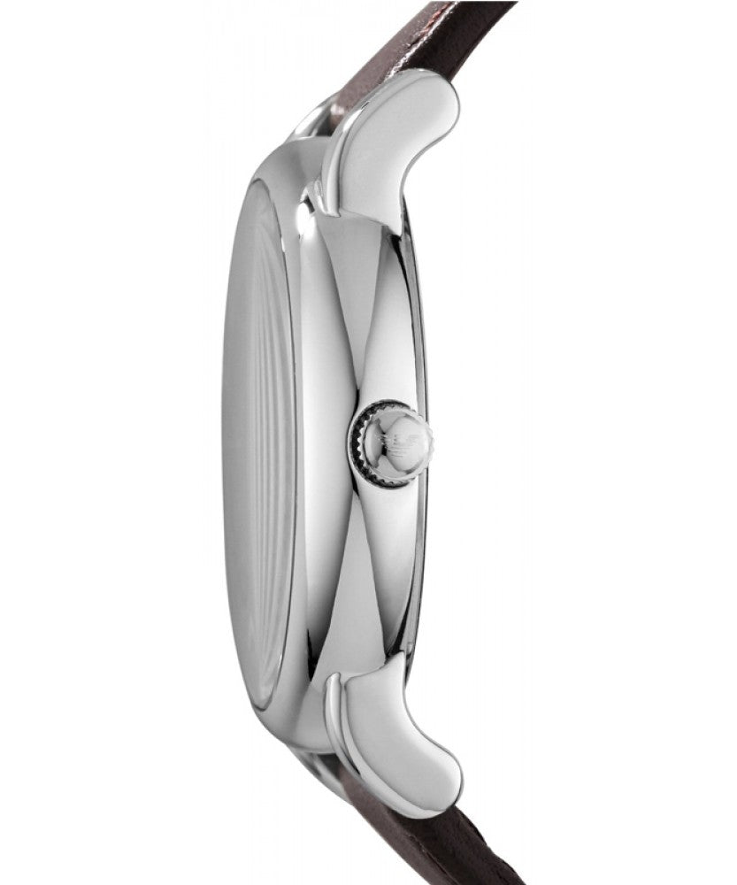 Emporio Armani Classic Gent’s Watch has a Stainless steel case with a brown leather strap. Fixed stainless steel bezel. Brown dial with silver-tone hands and index hour markers. The Emporio Armani logo marks the 12 o'clock position. Dial Type: Analog. Date display at the 3 o'clock position. Quartz movement.