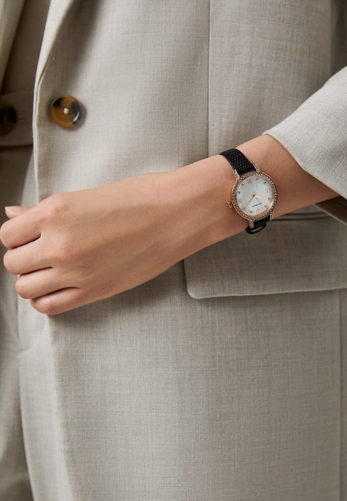 Emporio Armani Cleo Three-Hand Mother of Pearl Dial Black Leather Strap Watch For Women - AR11485