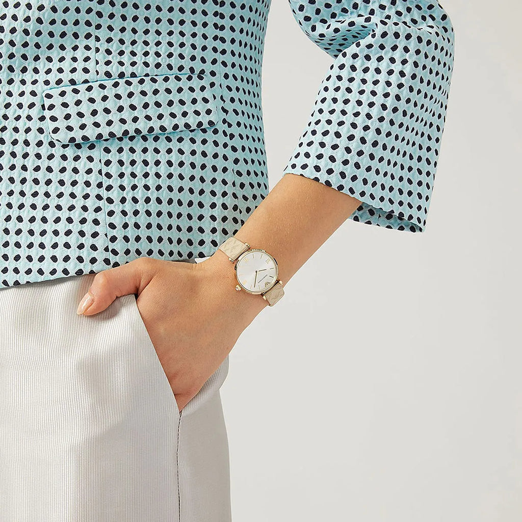 Emporio Armani Gianni T Bar Analog Silver Dial Beige Leather Strap Watch For Women - AR11127