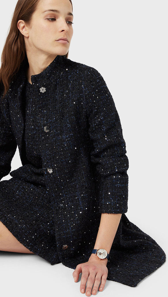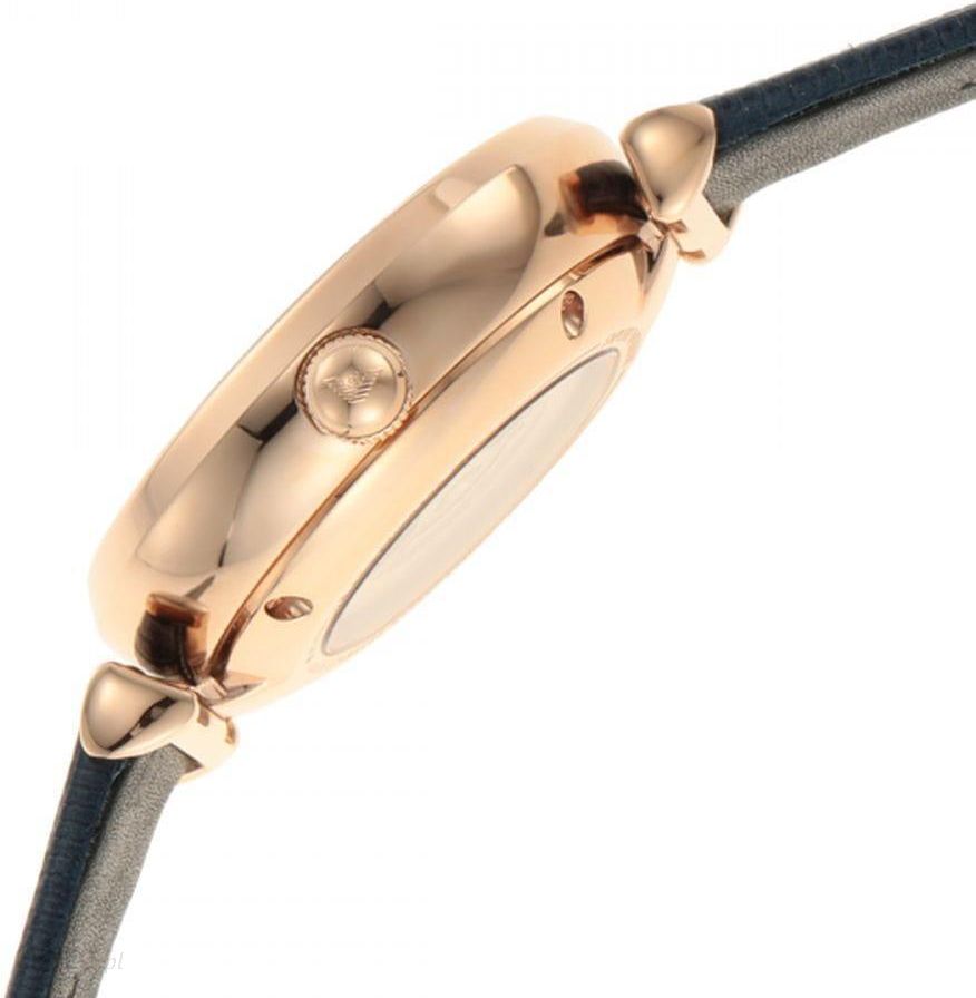 Emporio Armani's 34mm watch features a silver sunray dial with rose gold-tone Roman numeral and stick indexes and see through skeleton subeye, three-hand movement and blue leather band.