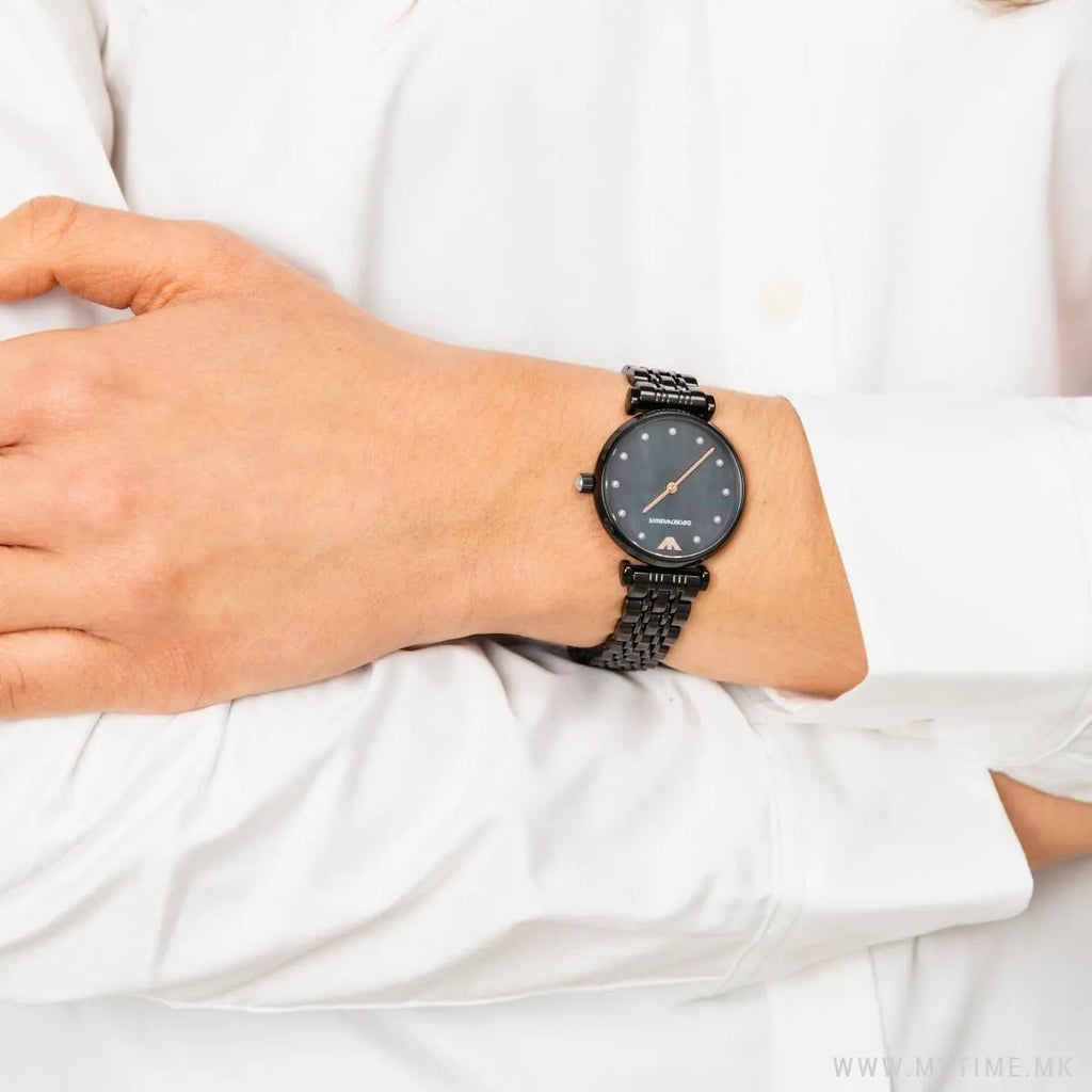 Emporio Armani Gianni T-Bar Quartz Black Mother of Pearl Dial Black Steel Strap Watch For Women - AR11268