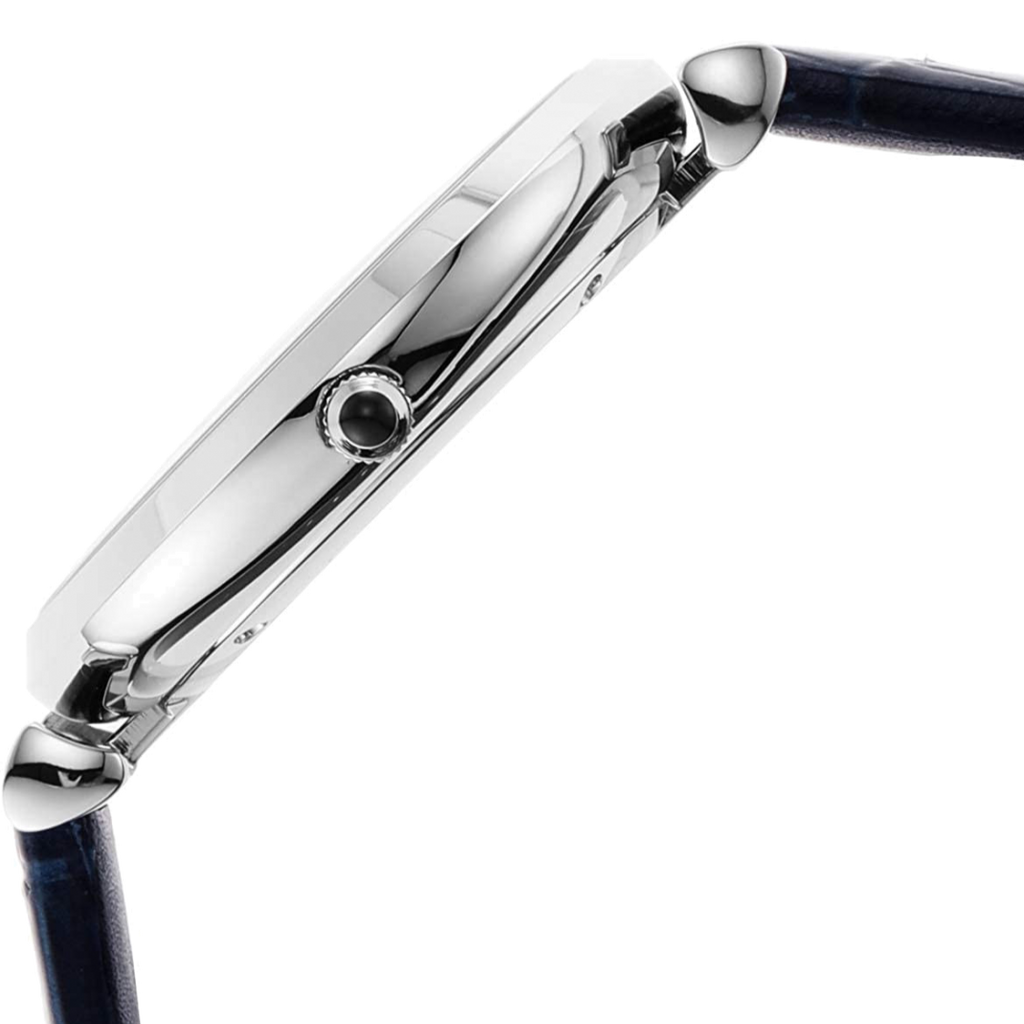 The blue dial features silver details on the hands and indexes, complemented by a supple navy blue leather strap.