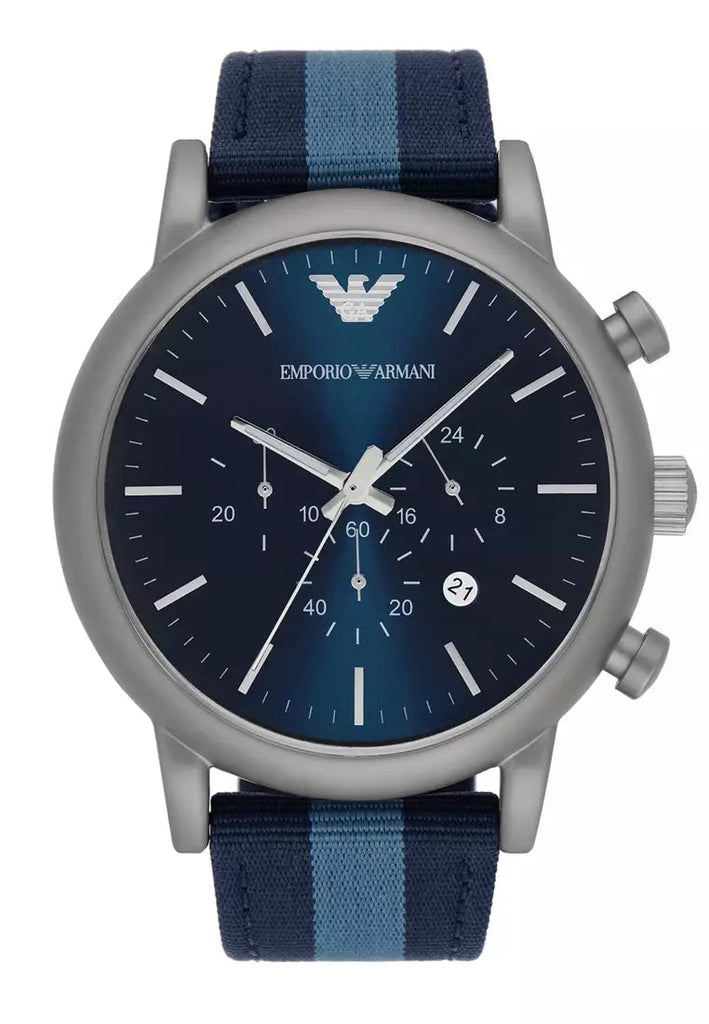 A blue striped nylon fabric is applied to a leather strap on this Emporio Armani men's watch for a stylish and functional interpretation. The silver-tone case and navy blue dial inspired by the colors of the Emporio Armani runway collections are accented with silver-tone indexes, subdials and the EA logo.
