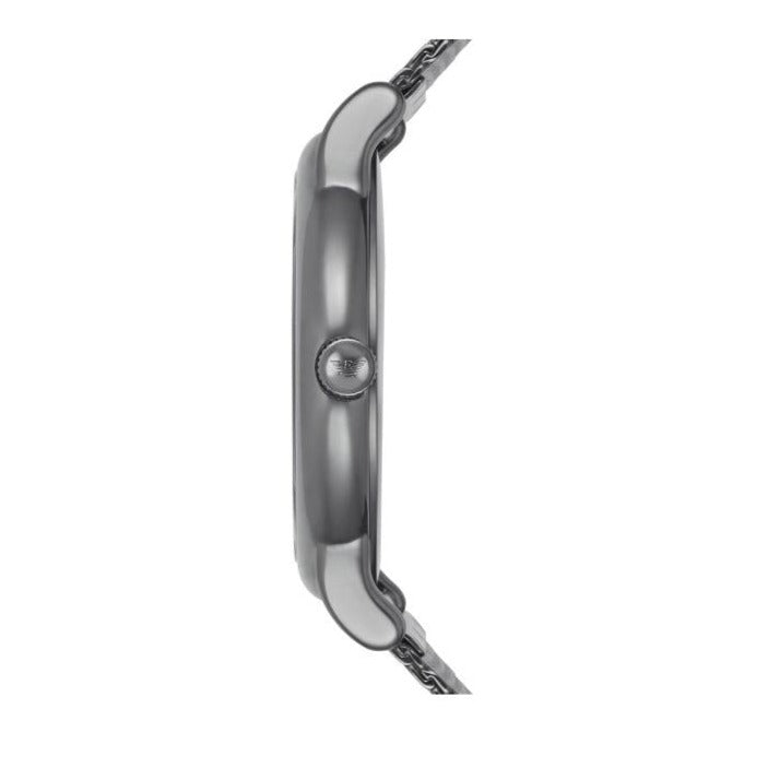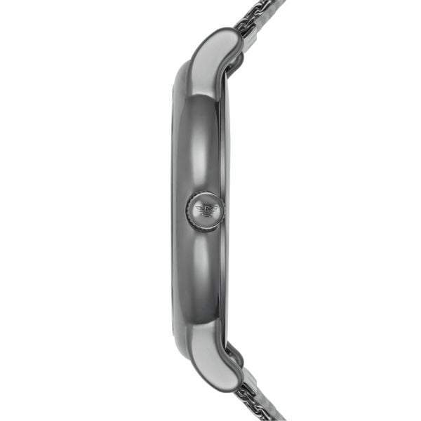 This contemporary Emporio Armani watch features an Armani blue sunray dial with date window and a gunmetal IP case and fluid mesh bracelet.