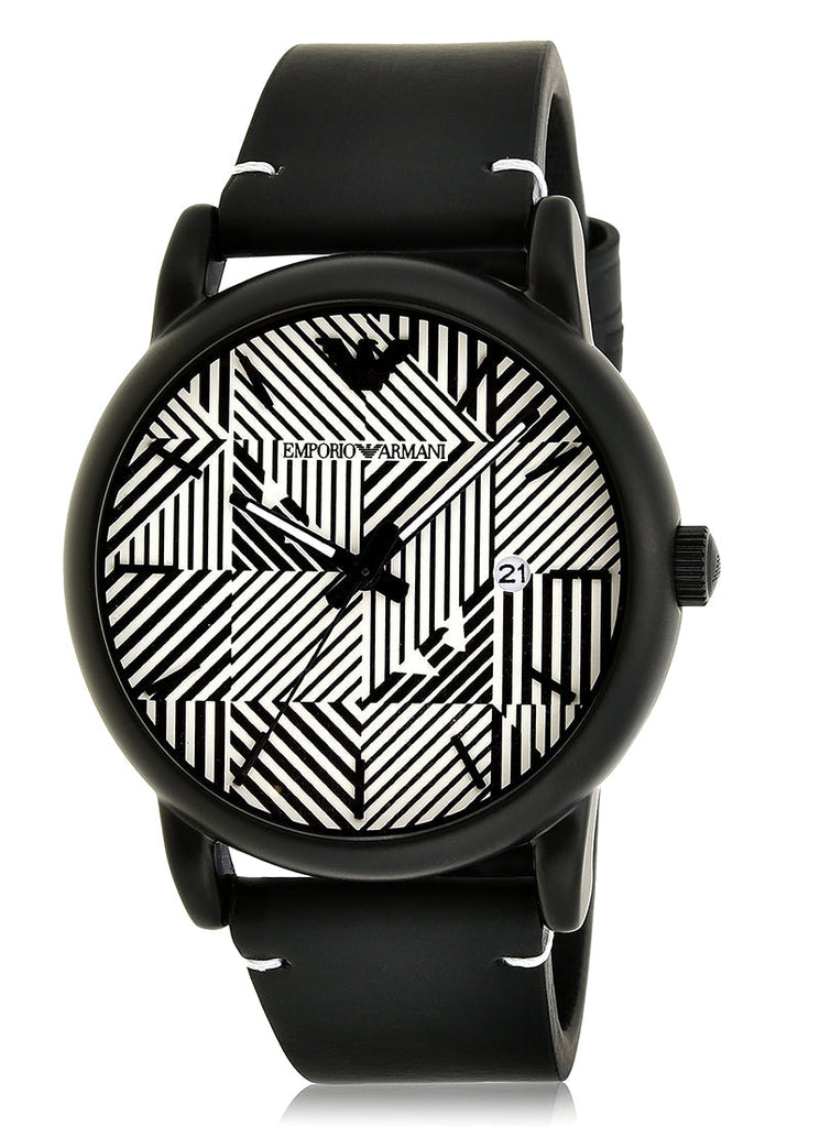 Emporio Armani AR11136 is a handsome 43mm men's watch with a black leather strap. The black and white patterned dial adds to the charm of this timeless piece. It's water resistance of of 50m is an added advantage.