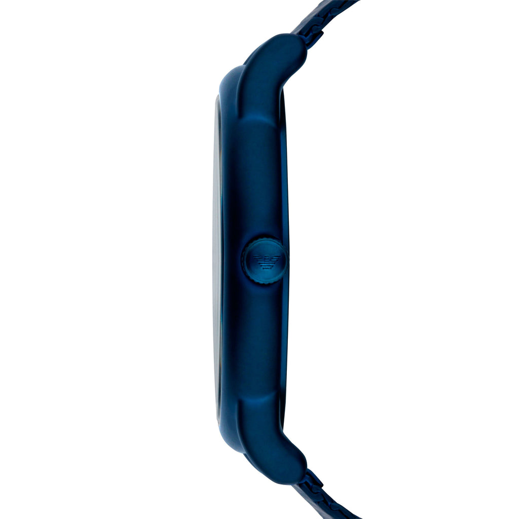 This contemporary Emporio Armani watch features a minimalist matte white dial with date window and an Armani blue IP case and fluid mesh bracelet.