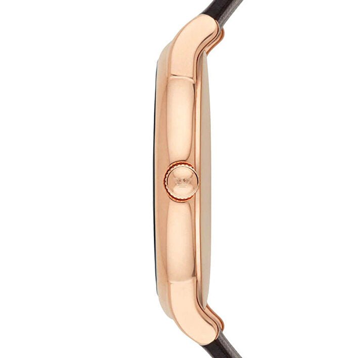 This men’s Emporio Armani watch has a PVD rose gold plated case and is powered by a quartz movement. It is fitted with a dark brown leather strap and has a off white dial. The watch also has a date function.