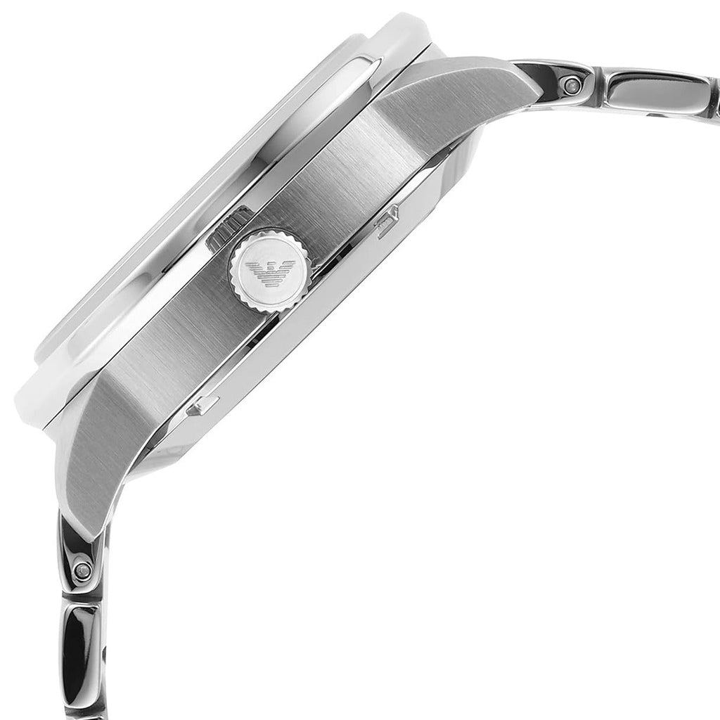 Emporio Armani's 43mm watch features a three layered dial with blue Côtes de Genève and multiple finishings, automatic movement and stainless steel bracelet.