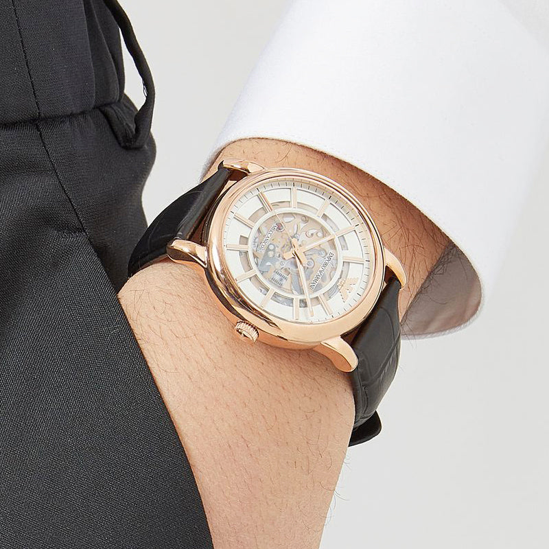 Emporio Armani Men's Automatic Brown Leather Timepiece - This 43mm watch features a white skeleton dial with rose gold-tone stick indexes, automatic movement, and a brown genuine leather strap. Composition 70% Stainless Steel, 15% Leather, 12% Crystal, 3% Plastic. This stylish and handsome timepiece is sure to complete any man's collection.