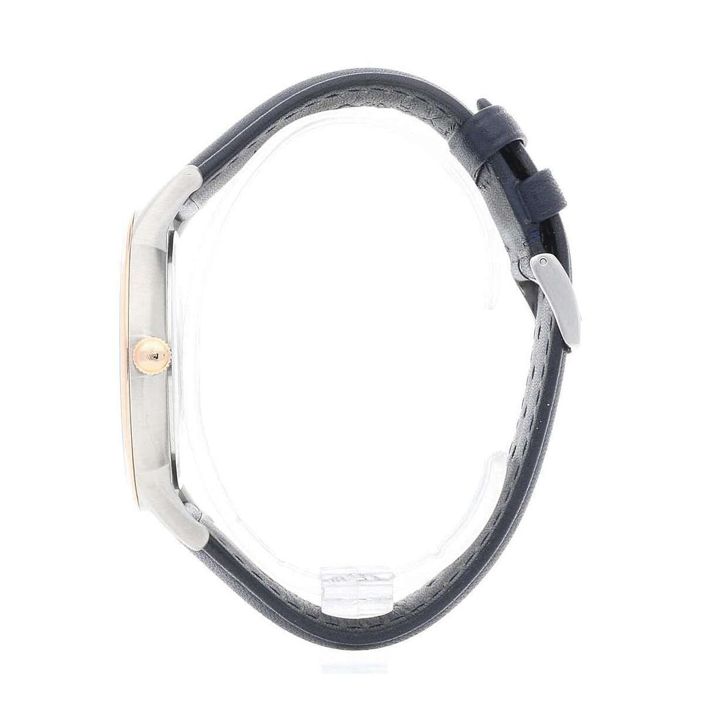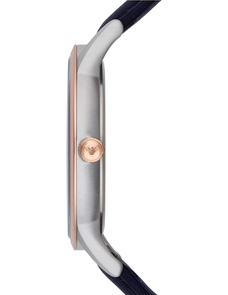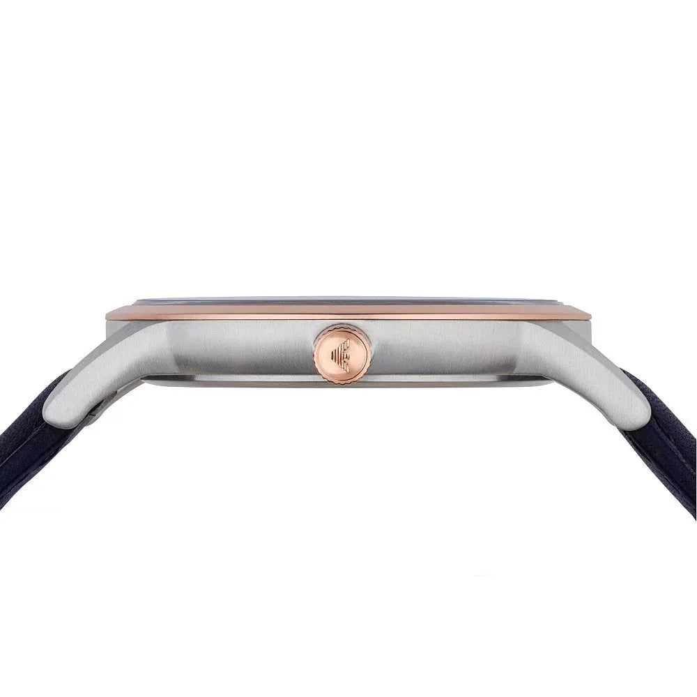 Add some style to your wrist with this men's watch from Emporio Armani. The 43 x 8mm rose tone stainless steel case houses a blue dial with clear rose tone baton hour markers and hands. There is also a date display window and the Armani logo at twelve o'clock. Finished with a 22mm blue leather strap, 50m water resistant.