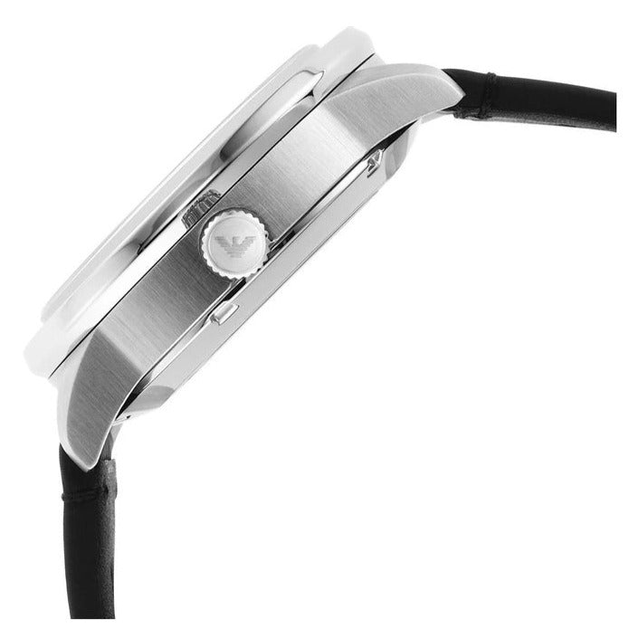 Emporio Armani's 43mm watch features a three layered dial with black Côtes de Genève and multiple finishings, automatic movement and black leather strap.