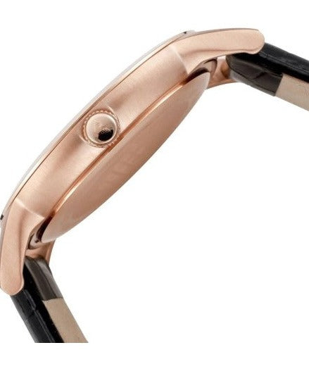 - Black Dial. Rose Gold PVD Plated Stainless Steel Hands and Indexes. Date at 6 O'Clock.