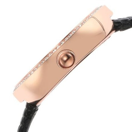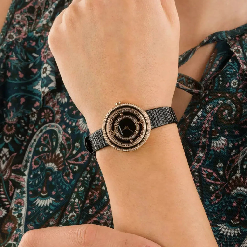 - This model exhibits a black dial with concentric circles of crystals and rose gold hour and minute hands.