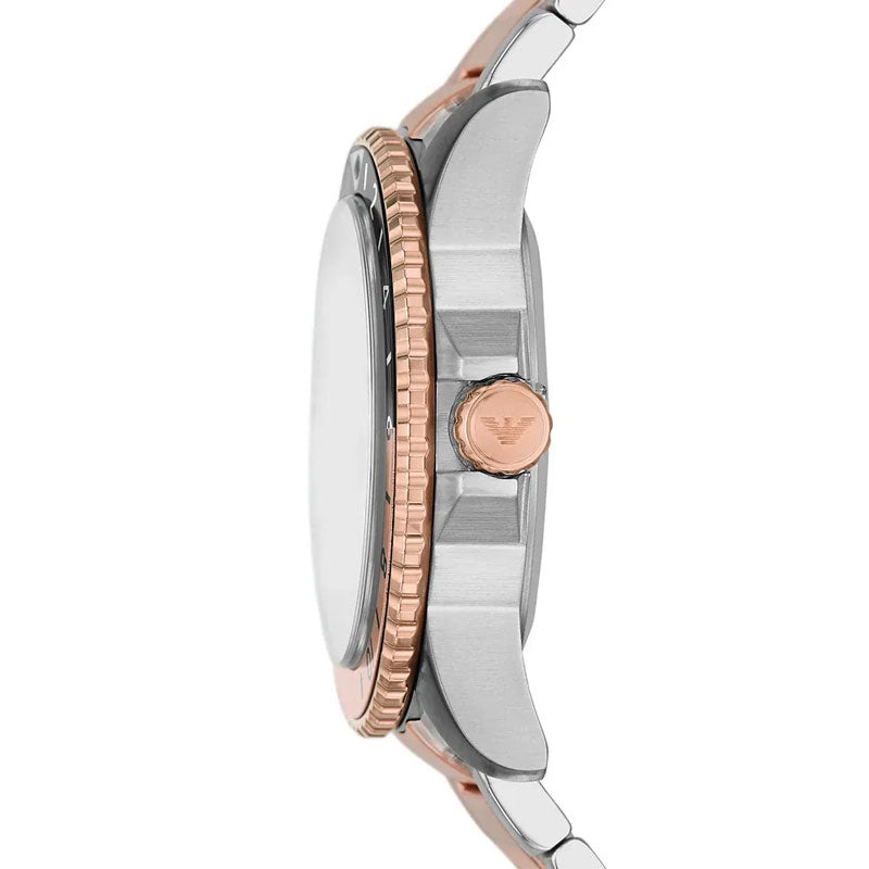Brand: Emporio Armani, Series: Sea Explorer, Gender: Men's, Model: AR11591, Movement: Japan Quartz, Case Size: 42mm, Dial Color: White, Case Thickness: 11.7mm, Case Material: Stainless Steel, Case Shape: Round, Case Back: Solid, Band Material: Stainless Steel, Band Type: Bracelet, Band Color: Rose Gold & Silver-Tone,