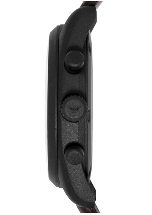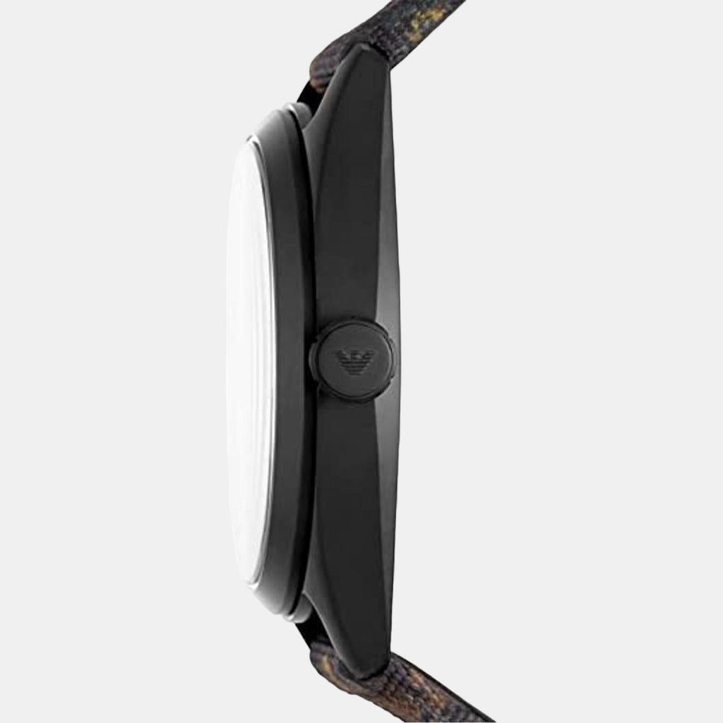 Black ion-plated stainless steel case with a dark brown leather strap. Fixed black ion-plated bezel. Beige sunray dial with luminous silver-tone hands and index hour markers. Minute markers around the outer rim. The Emporio Armani logo appears at the 12 o'clock position. Dial Type: Analog. Luminescent hands and markers. Date display at the 4 o'clock position. Quartz movement.