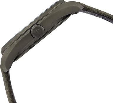 Stainless steel case with a khaki leather strap. Fixed stainless steel bezel. Khaki sunray dial with silver-tone hands and index hour markers. Minute markers around the outer rim. The Emporio Armani logo appears at the 12 o'clock position. Dial Type: Analog. Date display at the 3 o'clock position. Quartz movement.