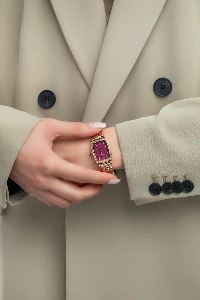 Emporio Armani's 26mm watch features a burgundy dial, stainless steel case with clear stones, two-hand movement and rose gold stainless steel bracelet.