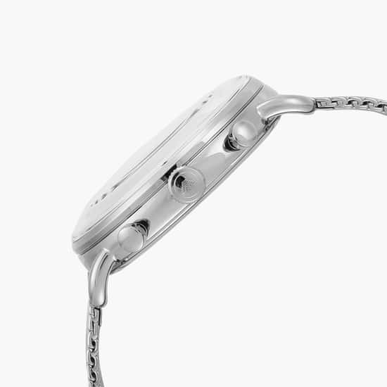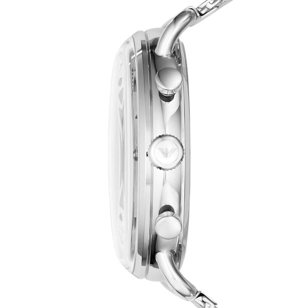 This aviator-inspired men’s Emporio Armani watch is handsomely equipped with a polished stainless-steel case, domed crystal lens, rounded lugs, black sunray chronograph dial and brushed-and-polished stainless-steel mesh bracelet.