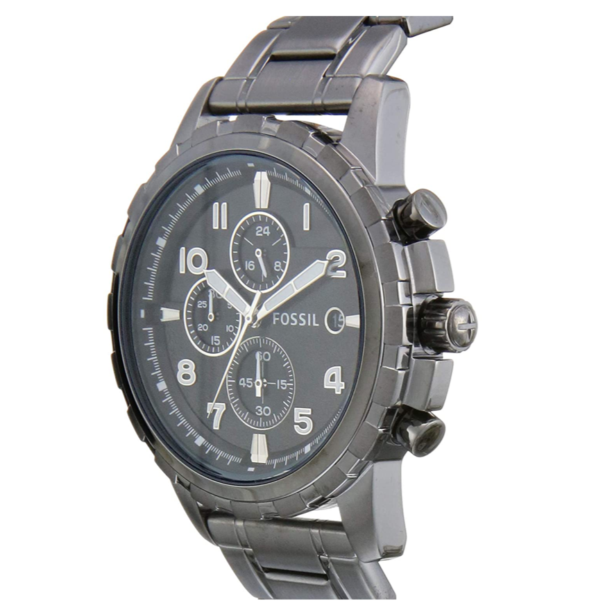 Scratch resistant mineral crystal. Pull / push crown. Solid case back. Case diameter: 45 mm. Case thickness: 11 mm. Round case shape. Band width: 24 mm. Fold over clasp with a safety release. Water resistant at 50 meters / 165 feet. Functions: chronograph, date, hour, minute, second. Casual watch style. Fossil Dean Chronograph Black Dial Smoke Grey Ion-plated Men's Watch FS4721.