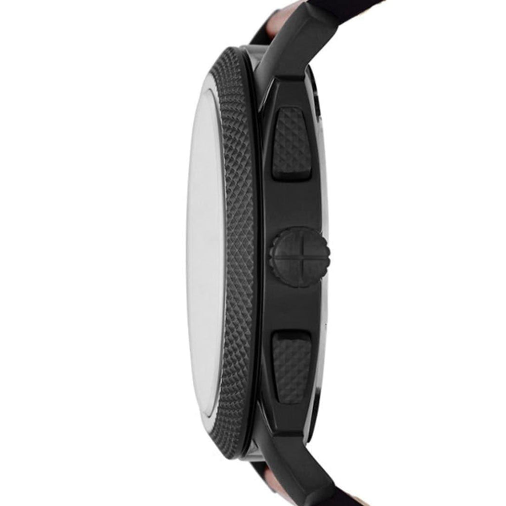 This Fossil Machine Chronograph Black Dial Men's Watch FS5234 comes in black ion-plated stainless steel case with a brown leather strap. Fixed black ion-plated bezel. Black dial with luminous black hands and index hour markers. Minute markers around the outer rim. Dial Type: Analog. Luminescent hands and markers. Date display between the 4 and 5 o'clock positions.