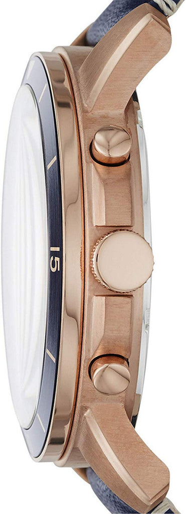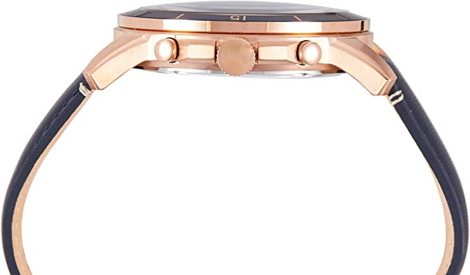 - Round rose gold tone plated stainless steel case with navy blue dial and Roman numerals