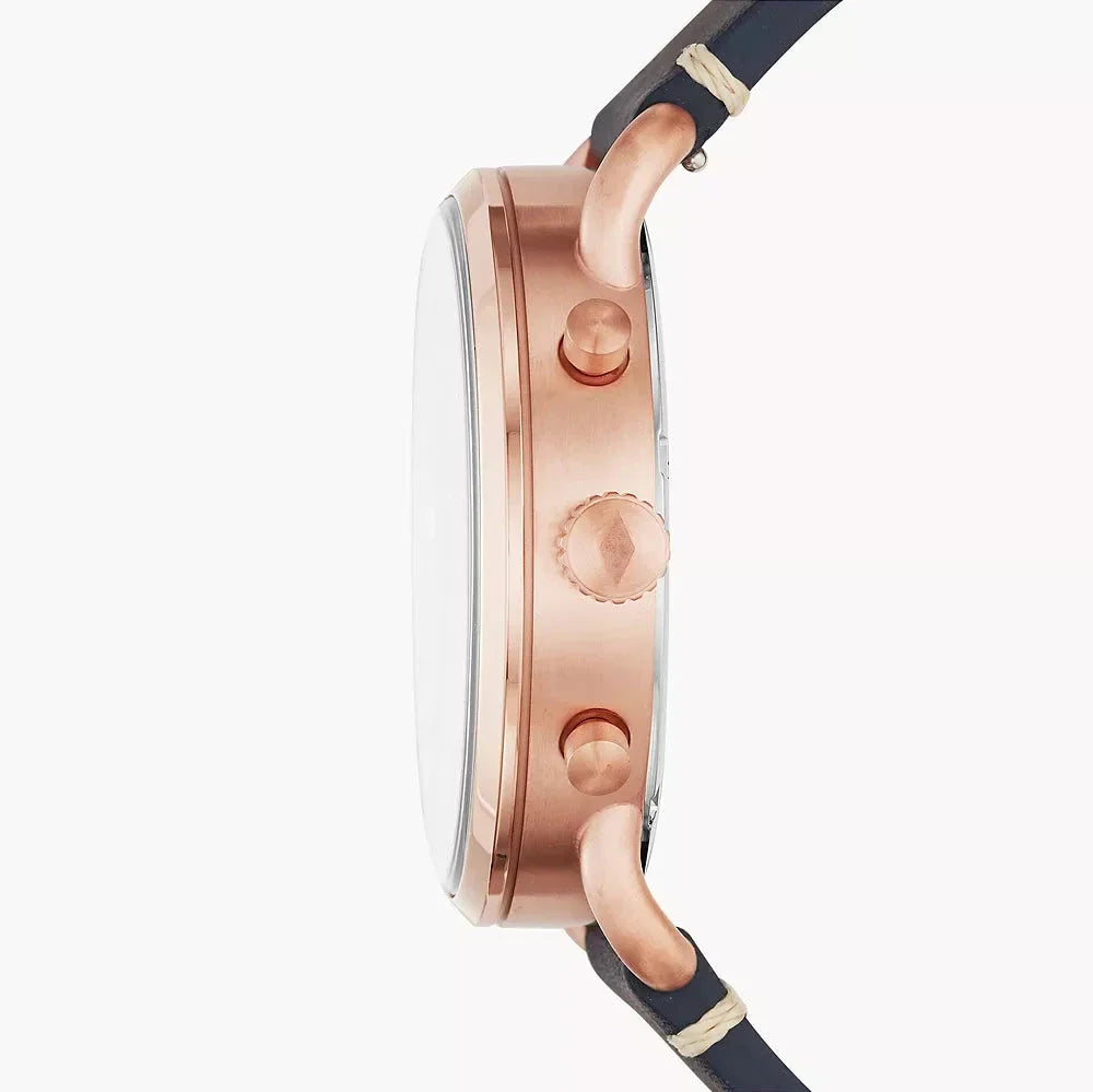 Fossil FS-5404 Commuter Leather Strap Men’s Watch. The case is made out of rose gold stainless steel with a rose gold bezel, which stands for the high quality of the item, it has a blue Dial. This model has got 100 meters of water resistance. it can be worn in scenarios where it is likely to be splashed but not immersed in water and will be fine in rain. The watch is shipped with an original box and a guarantee from the manufacturer.