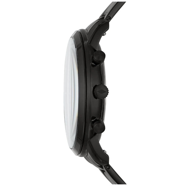 Chronograph - three sub-dials displaying: 60 second, 30 minute and 24 hour. Quartz movement. Scratch resistant mineral crystal. Pull / push crown. Solid case back. Round case shape. Case size: 44 mm. Case thickness: 12 mm. Band width: 22 mm. Fold over clasp with a safety release. Water resistant at 50 meters / 165 feet. Functions: chronograph, date, hour, minute, second, 24 hour. Casual watch style. Watch label: Japan Movt. Fossil Neutra Chronograph Quartz Black Dial Men's Watch .