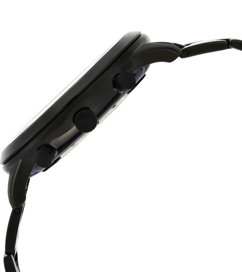 Black ion-plated stainless steel case and bracelet. Fixed black ion-plated bezel. Black dial with luminous silver-tone hands and index hour markers. Roman numerals mark the 6 and 12 o'clock positions. Minute markers around the outer rim. Dial Type: Analog. Luminescent hands. Date display between the 4 and 5 o'clock positions.
