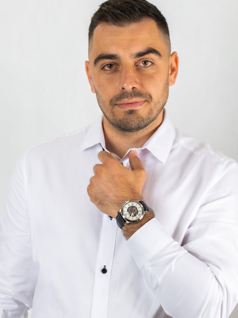 Fossil Grant Automatic Skeleton White Dial Black Leather Strap Watch for Men - ME3101