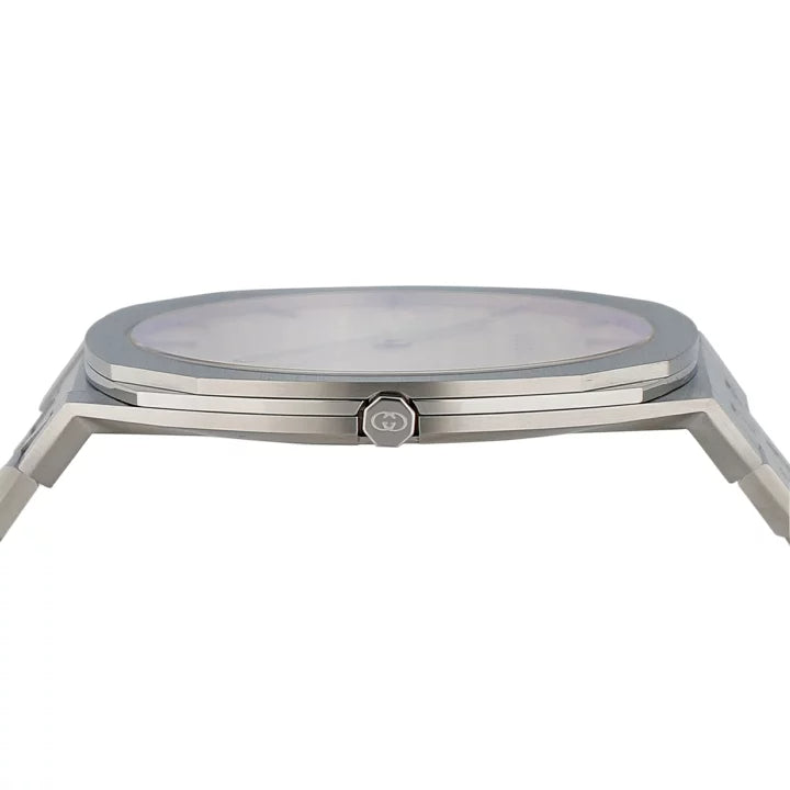 38mm stainless steel multi layered case, white dial with Interlocking G motif and pink coloured glass, five links stainless steel bracelet. Anti reflective sapphire with pink colour treatment. 3 ATM (30 metres/98 feet). Quartz movement. Wrist size from 120mm to 195mm YA163410 Swiss Made