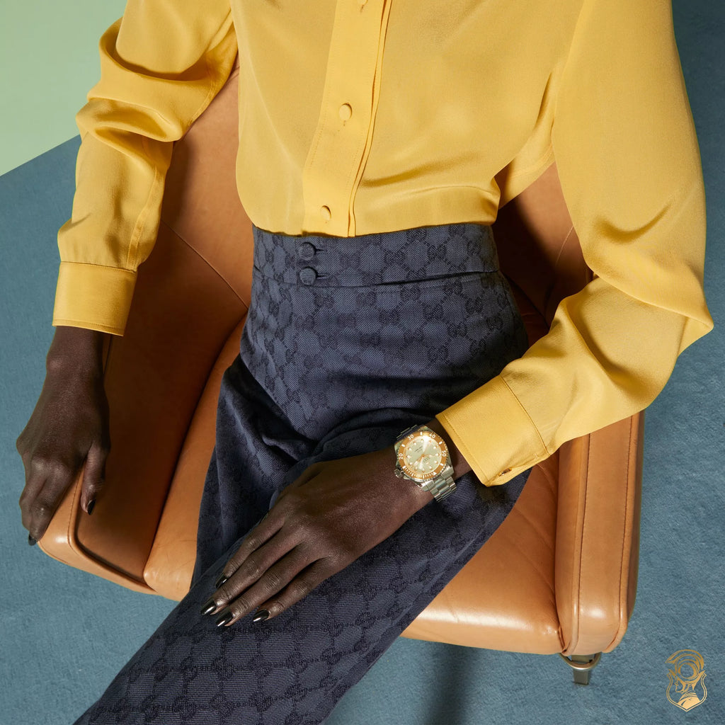 Silver-tone ‘Gucci Dive’ automatic watch from Gucci. This model features a stainless steel bracelet and 18k gold plated 40mm case, a dial with the brand's signature bee and logo as well as sapphire glass with antireflective coating.