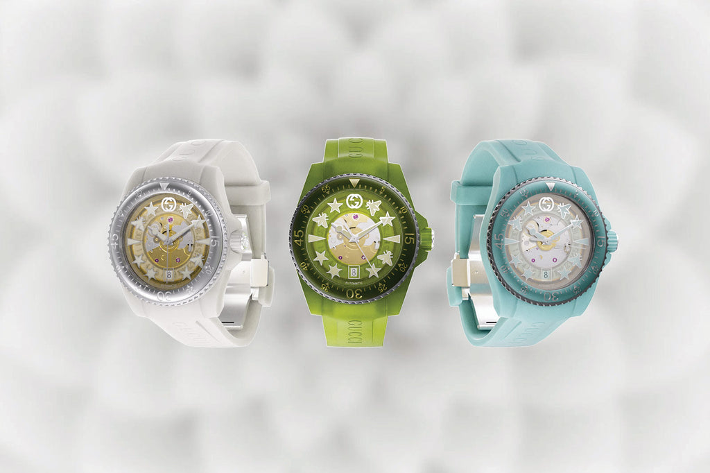 Featuring a design inspired by the underwater world, Gucci Dive has a contemporary appeal, combining a matte white steel and bioplastic case with a transparent dial, multi-icon indexes and matching strap. The watch has become an emblematic accessory, reinvented in new materials and colors every season.