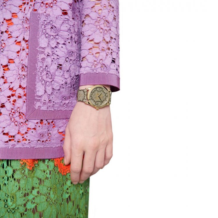 Yellow gold PVD stainless steel case with a leather strap. Fixed yellow gold PVD bezel. GG supreme canvas dial with yellow gold-tone hands. No markers. Dial Type: Analog. Quartz movement. Scratch resistant sapphire crystal.